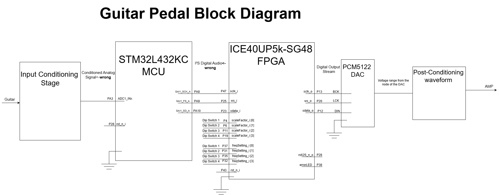 This project implements a digital guitar pedal capable of applying a real-time chorus effect to an instrument input. The system utilizes a hybrid architecture featuring a microcontroller (MCU), an FPGA, an external DAC, and custom analog circuitry. The analog front-end passes the guitar input through gain scaling and offset adjustment, followed by 4th-order anti-aliasing filters. The signal is then digitized by the MCU’s internal ADC and transferred via DMA to an SAI module for output in I2S format.