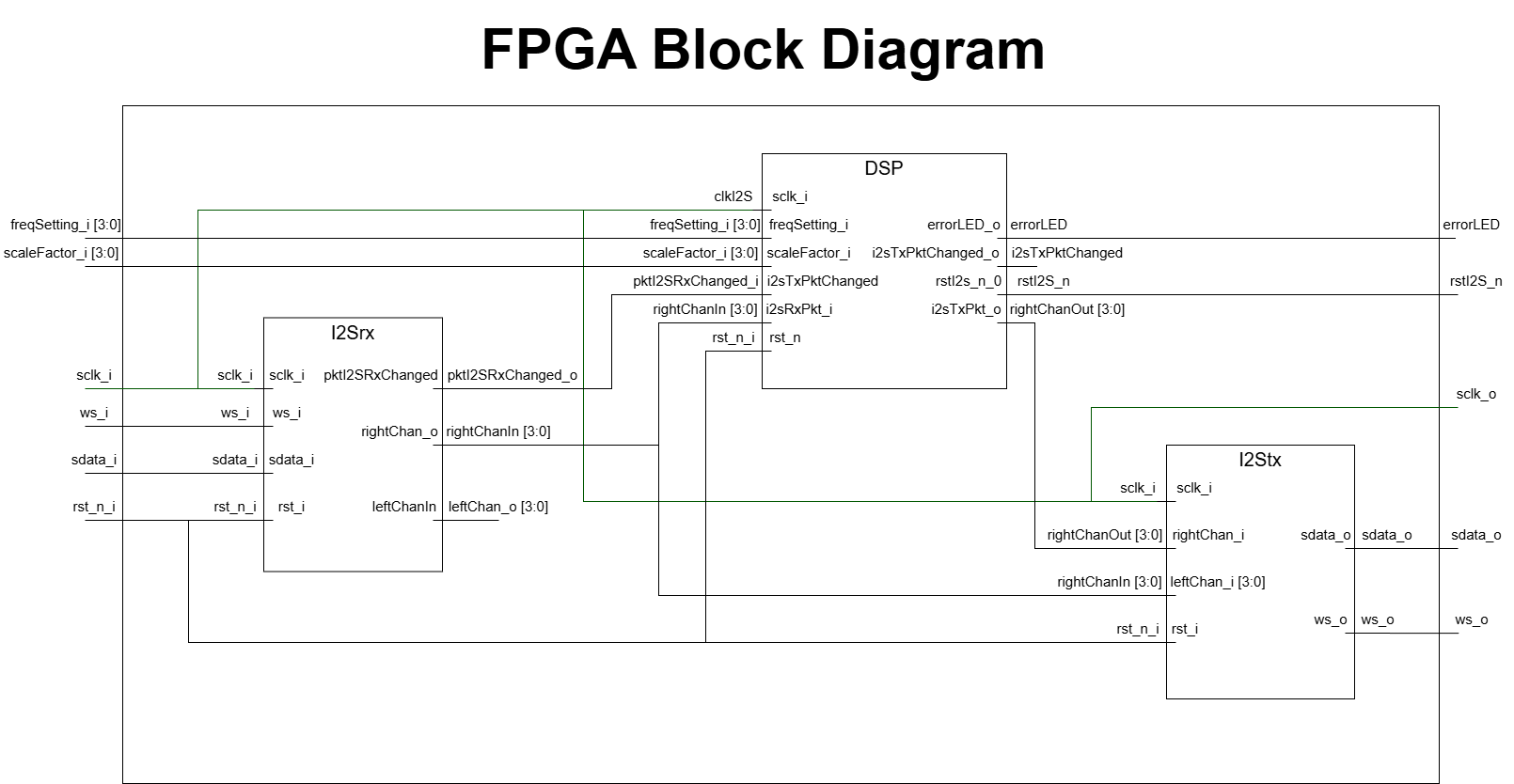 This module is responsible for recieving the I2S data from the MCU and converting it into a 16 bit package for the Left and Right channel. This module is mainly a large shifter that shifts the data in and latches the channel values as described by the I2S module, describe in more detail under the documentation tab. This module uses the sclk input as a clock signal to drive the seqquential logic. It wasn’t until later that the team realized this might not have been standard practice and could lead to digital noise.